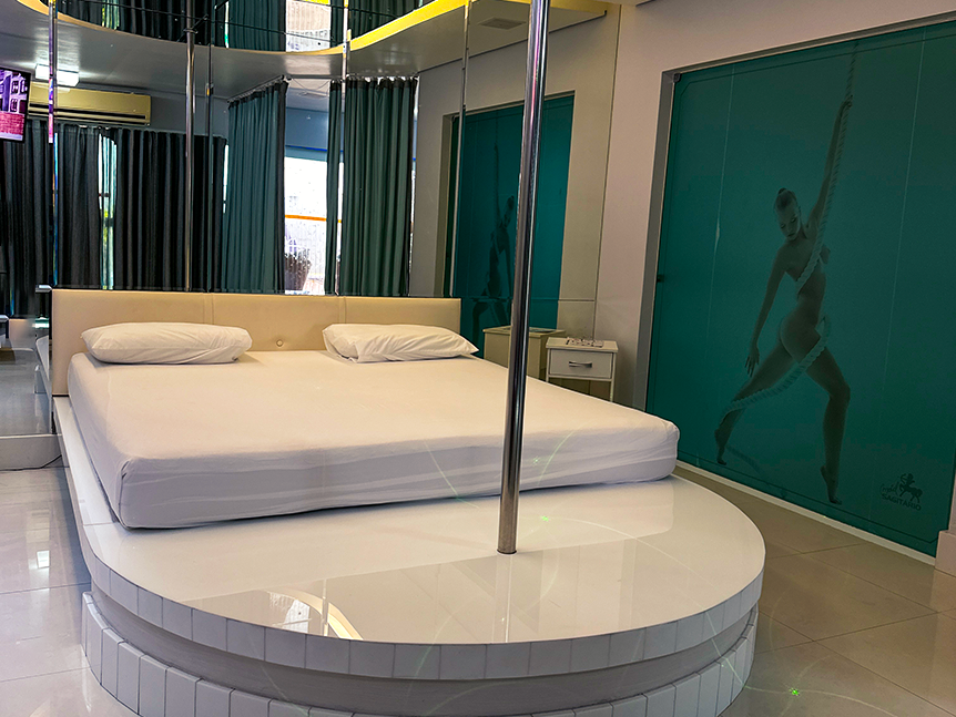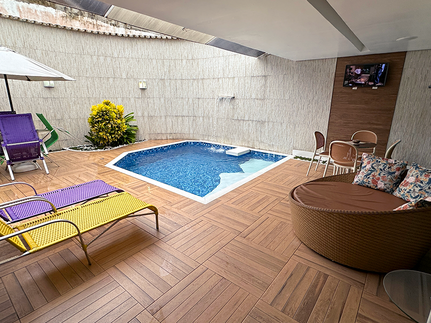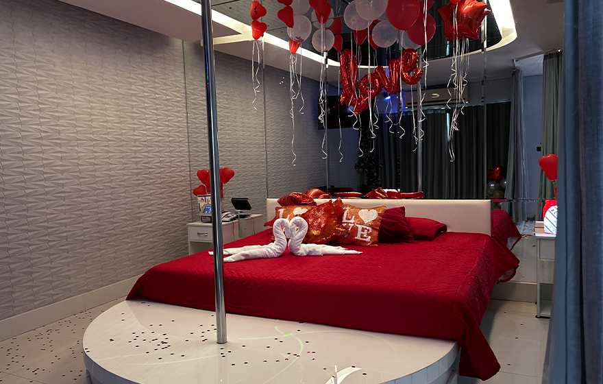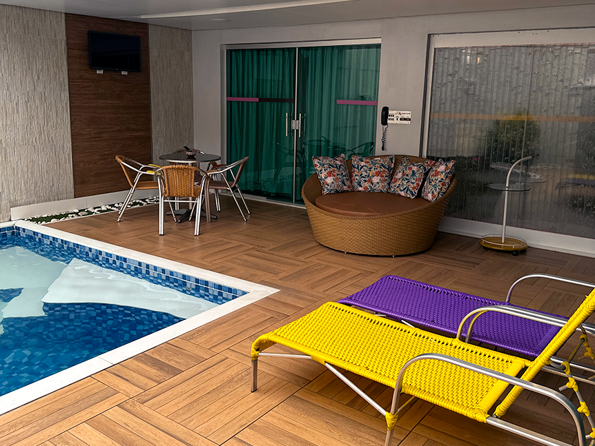 O cenário perfeito para comemorar o amor. Três TVs, hidromassagem, piscina com cascata, pole dance e área externa compõem um ambiente único.